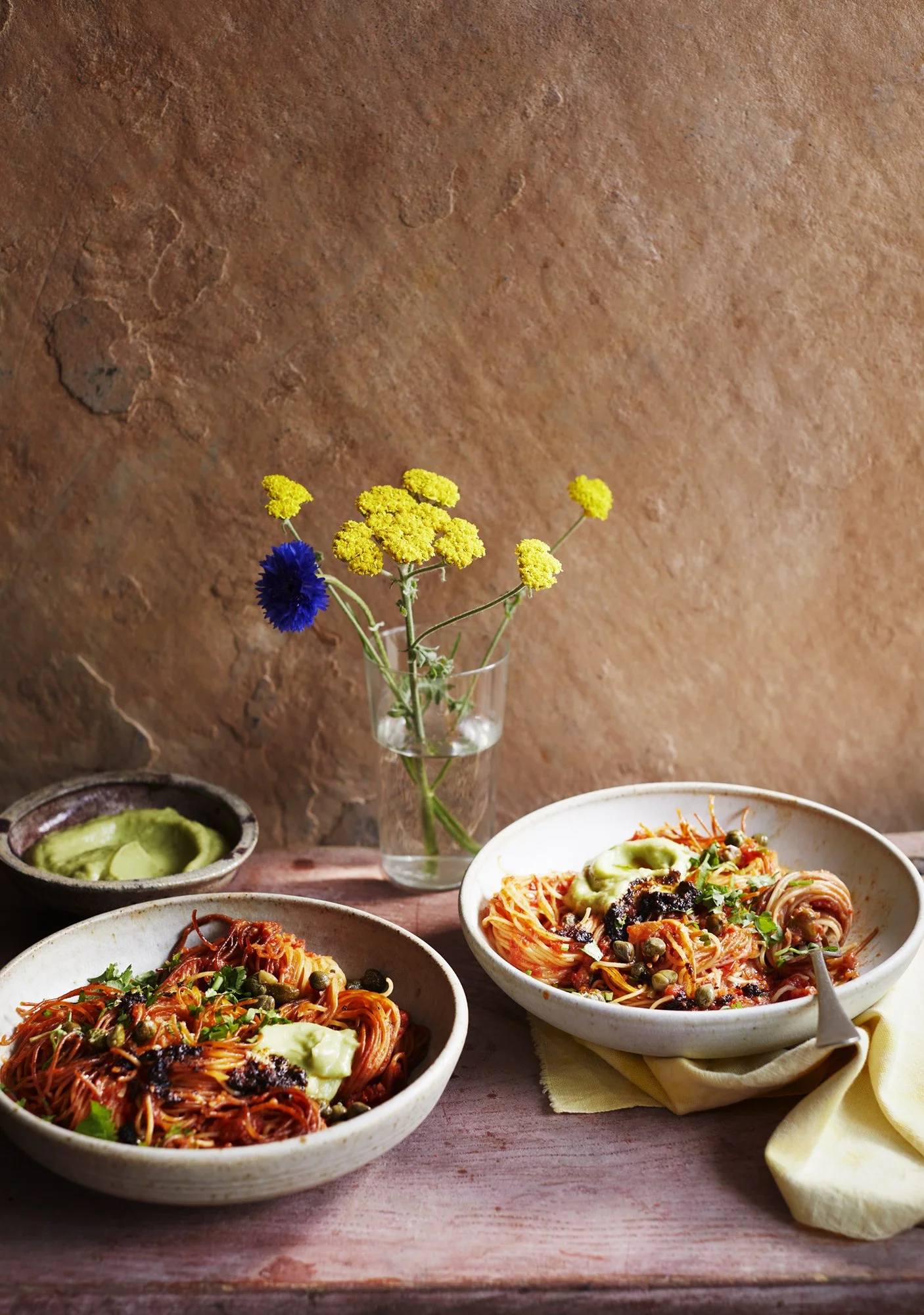 Fideus with Capers, Salsa Negra & Avocado Cream
