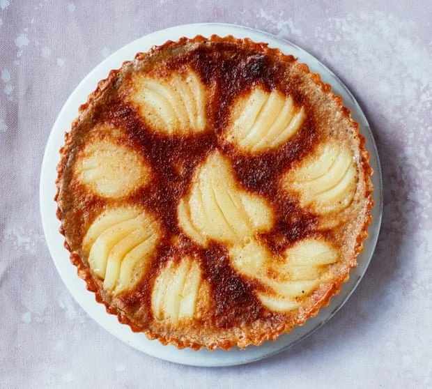 Pears used to be an enigma to me. Once in a blue moon, I had the perfect one: sweet, juicy with a hint of crispness and delicate floral notes – how I loved those pears! Sadly, more often than not, they are rock-hard or mushy. Then I started keeping them in the fridge and I have not looked back. Make this delicate, creamy tart with pears that are still quite firm. It makes a stunning pudding. Pears are in season (in the UK) from September-January.